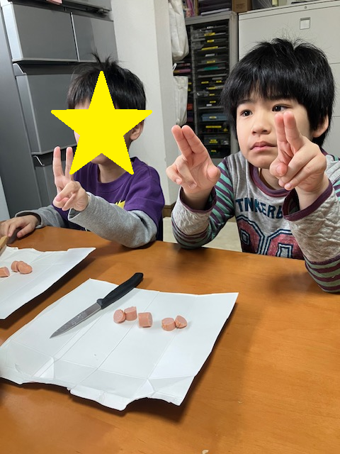 ウィンナー上手に切れてピース!